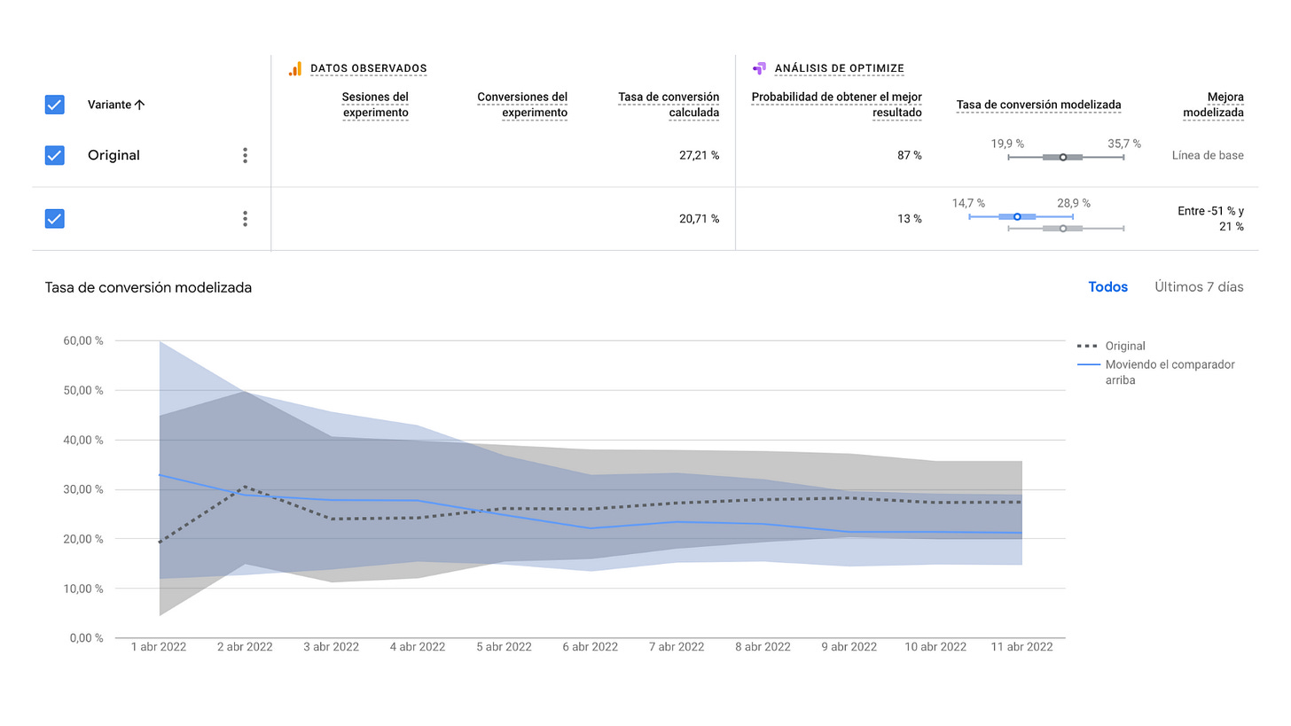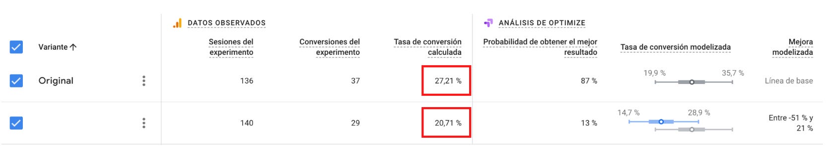 Como se puede ver en esta tabla de Google Optimize con resultados, la variante original (también llamada grupo de control) genera una tasa de conversión de casi 7 puntos por encima de la 2ª variante (también llamada grupo experimental).