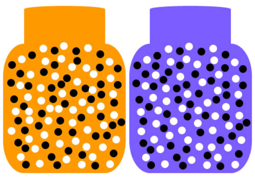 Volvamos de nuevo a las canicas (Pero esta vez, el bote núm. 1 contiene 50 canicas negras y 50 blancas y el bote núm. 2 contiene 90 canicas negras y solo 10 blancas). Supón que tienes los ojos vendados cuando seleccionas la muestra (la canica), por lo que no sabes de qué población (bote) proviene. Tu tarea es observar la muestra que obtienes y luego decidir qué bote es el más probable.